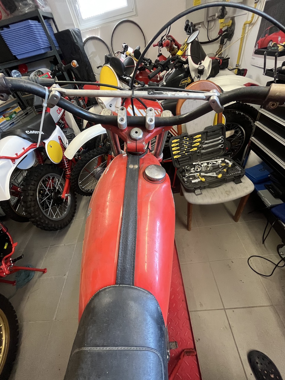 die steht hinten rechts in der Ecke vor der Suzuki, daneben noch die Aspes, kann man nicht sehen. Ganz links befindet sich die TTR 600. Insgesamt stehen dort 8 Mopeds, zur Not gehen auch 9 rein ;)