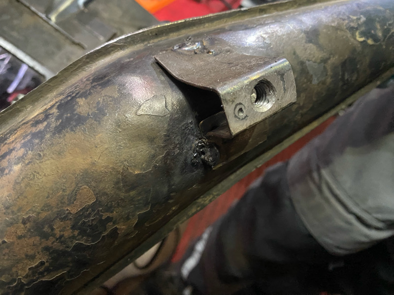 Also das Fragment vom Auspuffhalter und das Endrohr erstmal abgetrennt, um Bewegungsfreiheit zum Anpassen zu schaffen. Trotzdem mussten wir das Krümmerrohr mit einem im Innendurchmesser passenden Richtrohr etwas kaltverformen, um der Birne Platz zum Rahmen zu verschaffen. War aber unproblematisch und passte beim ersten Versuch.