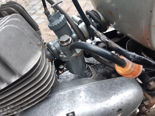 Fehlteil an dem Motor war der Vergaser. Es gehört ein UB20s mit Seitenschwimmer dran. Zwei Leichen aus dem Netz besorgt und einen halbwegs gesunden daraus zusammengefuddelt. Obacht, der Seitenschwimmer ist angeschraubt, und es gibt ihn mit verschiedenen Winkeln. Zum riesengroßen Glück hatte ich zwei unterschiedliche erstanden, einer falsch, einer richtig.