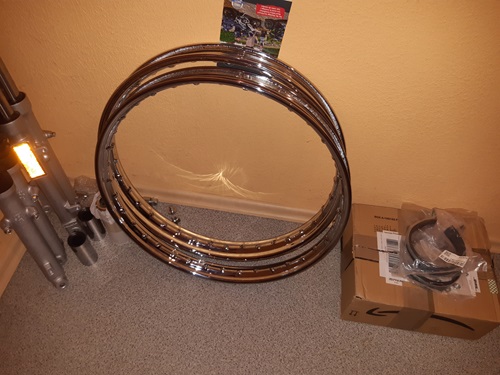 . Die Faltenbälge sind von einer Yamaha FS 1, also passt das Zeug zumindest in die Zeit. Vorteil ist, ich musste nix originales zerstören, alles wieder zurückrüstbar. Den Haltenocken an der neuen Gabel musste ich etwas nacharbeiten, daß er in die Nut der Bremsankerplatte passt. Den Achsanguß der Ankerplatte musste ich allerdings kürzen. Den Abschnitt hab ich auf der anderen Seite gut als Distanzbuchse verwenden können. Die musste ca. 4,7 mm haben. Mit Schreinermethode angepasst