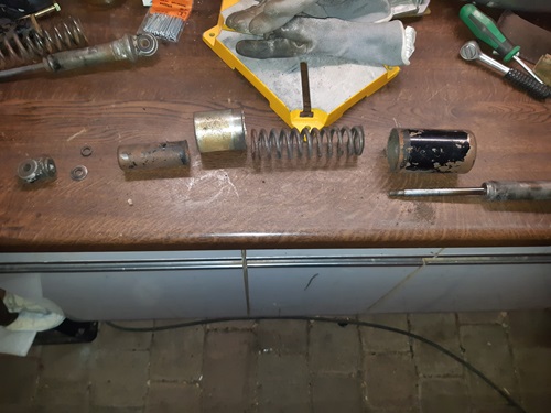 OK mal schnell die Federn raus, die Dämpfer gesäubert, geschliffen und abgeklebt. (Ja der eine Zipfel Klebeband kommt noch weg
