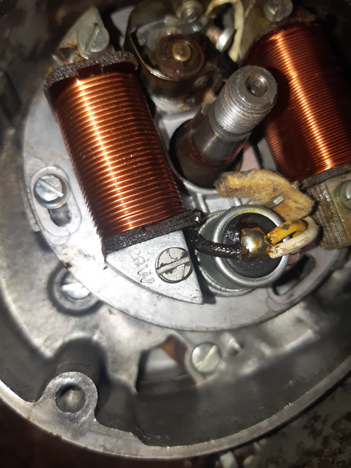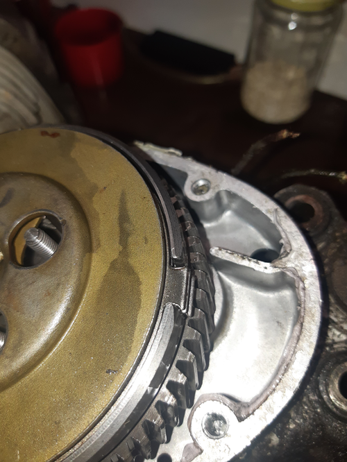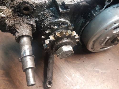 ich hab mal den Motor angefangen zu zerpflücken. Erst mal das Kickstarterritzel und Kettenritzel von der Welle genommen. Das Kettenritzel hat auf der Rückseite einen Bund, der in einem Simmerring läuft. Heißt, wenn man das Ritzel abmontiert, läuft das Öl raus