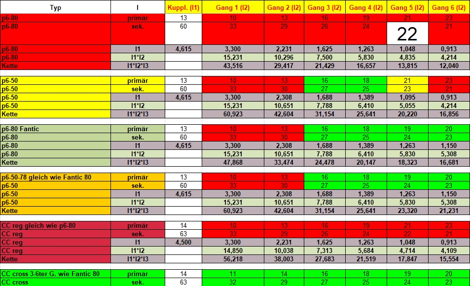 Und ja 22 Zähne das ist der 5te Gang sekundär p6-80, das einzige übrigens mit 22 Zähnen im p6-80 oder auch p6-50, egal ob vor oder nach 78 im p6-50 gibts keins mit 22 Zähnen anbei ein Bild meiner Getriebetabelle.