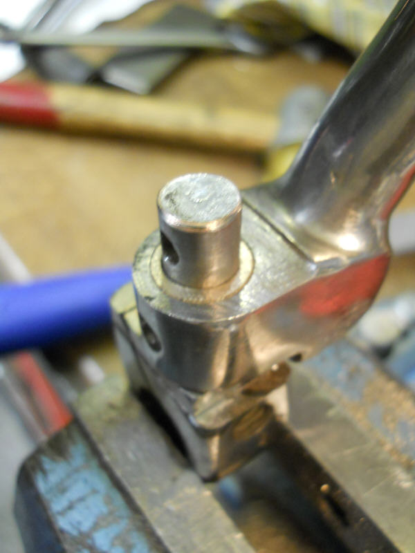 Da der Bolzen auf dem sich das Kickstarteroberteil dreht auch schon leidlich ausgeschlagen war, Hab ich einerseits das Unterteil mit dem Bolzen abgedreht und das Oberteil erst aufgebohrt und dann mit einer Bronzebuchse versehen. In diese dann eine passende Bohrung gebohrt und gerieben, so das der Bolzen jetzt schön darin läuft.
