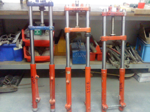 Tausche dafür die Samfisgabeln die linke auf dem Bild hat eine Marzocchi-Gabelbrücke, die anderen haben jeweils eine Samfis-Gabelbrücke.