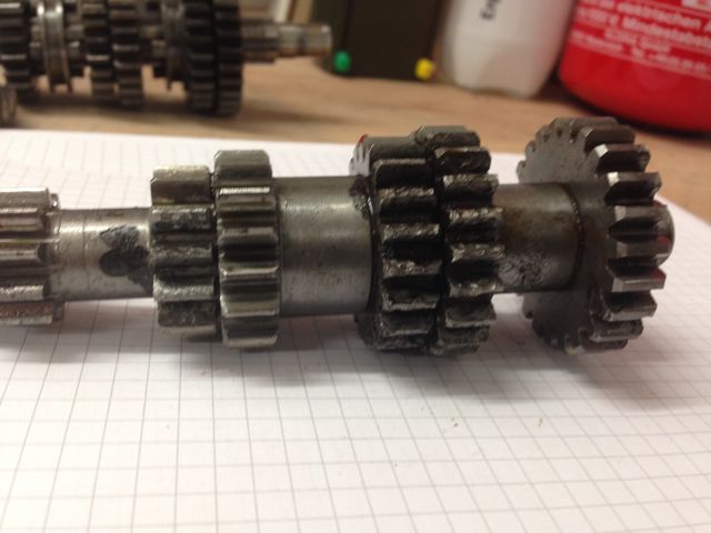 Hallo, habe mal ein paar Fotos gemacht. Die Welle mit den kleineren Zahnrädern ist meiner Meinung nach völlig unbrauchbar, bei der anderen Welle ist das große-abnehmbare- Zahnrad auch nicht zu gebrauchen, der Rest scheint noch in Ordnung zu sein. Der Kupplungskorb mit Primärantrieb sieht aus, als käme er aus der Bronzezeit.