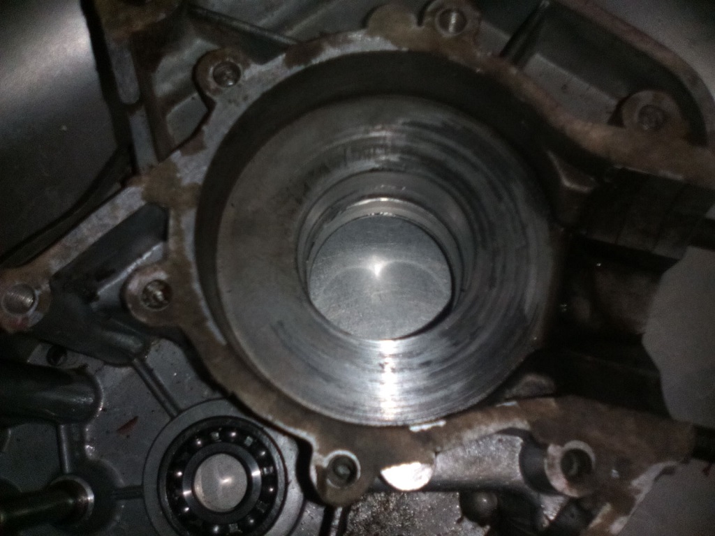 Dabei entdeckte ich, daß die Kurbelwelle rechts und das Kurbelgehäuse rechts Schleifspuren aufweisen, weil das Lager rechts ca. 5mm tief im Gehäuse versenkt ist und die KW so nach rechts wandern kann.