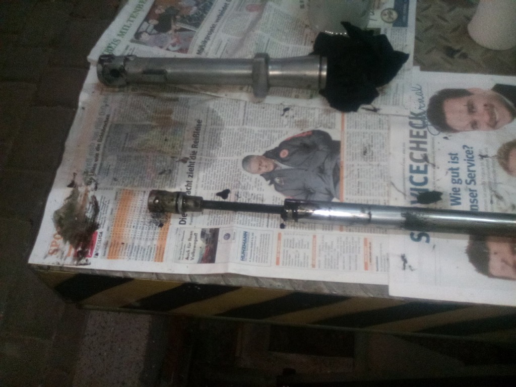 Die eine Gabel hat mir sehr viel Spaß bereitet, da die Inbusschraube die von unten drinnen sitzt und das Dämpferelement hält sehr widerspenstig war, dann rund, auch die Torxmethode brachte nix. Dann wollte ich den Kopf wegbohren, das hat mir mehrmals den Bohrer an der Schneide beschädigt :evil: :D . hab dann mehrmals nachgeschärft und vor Frust mal einfach draufgehalten, die Hitze hat´s dann gerichtet :-). Schlitzschraubendreher draufgedengelt und auf einmal ging sie butterweich raus.