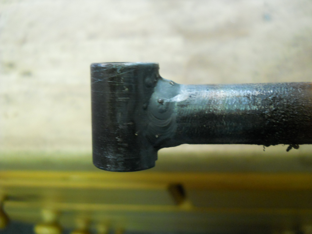 Die Welle/Bolzen ist soweit noch ganz Ok, also versucht die Bohrung wieder rund zubekommen. Aber da wurde mir das "Fleisch" dann doch etwas zu dünn, hab Angst der dünne Rest könnte nicht halten. Also ist jetzt neu machen der vordern Buchse des Bremsankers angesagt. Da kann ich auch sauber zum Bolzen die Bohrung machen und nachher das Ganze an den Bremsanker vorne anschweissen.