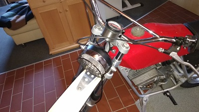 So weit ok. Der CEV Tacho ist neu und von 1990, mittlerweile würde ich einen mit schwarz weißem Zifferblatt suchen, aber ok. Die Tachowellenführung ist leider nicht gut. Ich bekomme den Tachoantrieb am Rad nur so montiert, daß die Welle genau senkrecht nach oben abgeht. Ich hätte sie lieber nach hinten gehen lassen, um sie in einem großen Bogen zu führen, ist besser wenn die Gabel einfedert. Aber gut, das bleibt erst mal so. Auch blöd ist die Tatsache, daß ich die Lampenhalter liebevoll rekonstruiert habe, die Welle jetzt aber am Lampengehäuse anliegt und dadurch einen blöden Bogen macht. Längere Lampenhalter wären jetzt klar besser, aber nuja. Vielleicht gibt´s ja eh nur ein Moped zum ankucken, da isses nicht so wichtig.