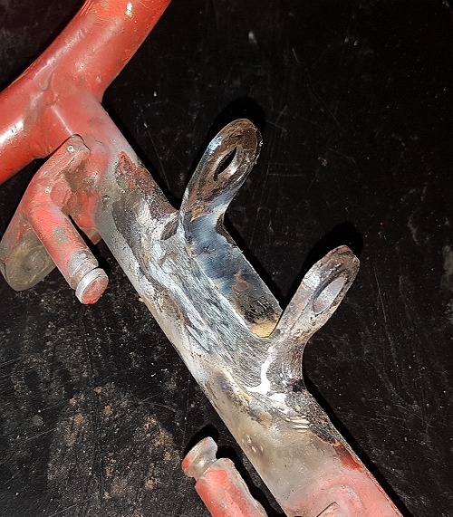 Die Motorhalterung vorne wurde irgendwann mal ziemlich wild wieder an den Rahmen gebrezelt und angemalt. Das habe ich nochmal geflext / geschweißt / geflext: