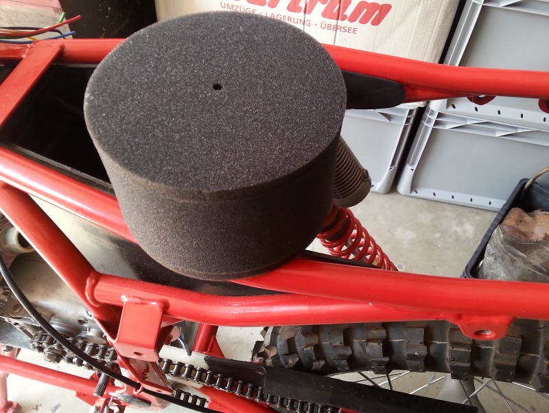 Sodann habe ich mich um den Luftfilter grkümmert. Der Kasten war ja leer. Ich habe dann einen Luftfilterschaum mit Käfig von einer Rieju MRT bestellt.