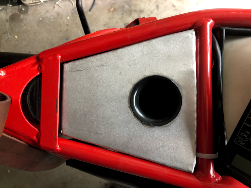 Das Befestigungsloch war schon im Rahmen (auf beiden Seiten). Warum auch immer. Für den Bremslichtschalter erfüllt es seinen Zweck. Zumindest auf der rechten Seite. Der Schalter ist recht unauffällig. Vielleicht könnte ich statt der auffälligen Feder alternativ ein Drahtgestänge einhängen, aber ich lasse es erstmal so.