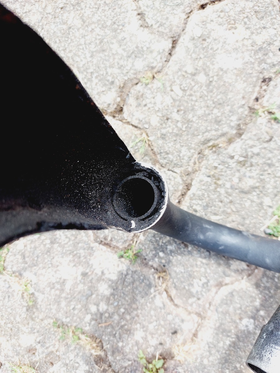 Also erst mal das Verbindungsrohr direkt am Ausgang der Birne abgeschnitten an der Schweißnaht. Hier konnte man schon erkenne, dass da wirklich ein zusätzliches Röhrchen drin steckt.