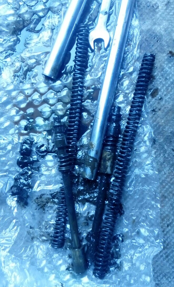 In den äußerlich guten Standrohren war eine Mischung aus Wasser, Matsch, altem Öl und Rost. Die Federn sind 4 (in Worten vier) cm kürzer als in der anderen Gabel. Die Windungszahl ist dabei gleich. Einfach hinüber und zusammengequetscht.