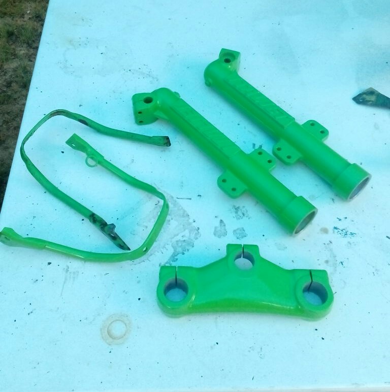 Haufen 2: Tauchrohre bis auf Schrammen tiptop, Gabelchrom hinüber, untere Gabelbrücke super, obere Gabelbrücke dafür mit abgeschliffenen Kanten
