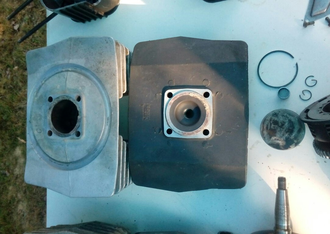Zwei Zylinder sind dabei. Einer ist am Ende und der zweite hat ne komische Ringnut oben. Merkwürdig. Einer der Zylinderköpfe scheint sogar neu oder fast neu zu sein. Zuletzt ist wohl auch der Ringnutzylinder gelaufen. Zumindest hat der einen ASS dran und der intakte Kolben passt hier sehr gut.