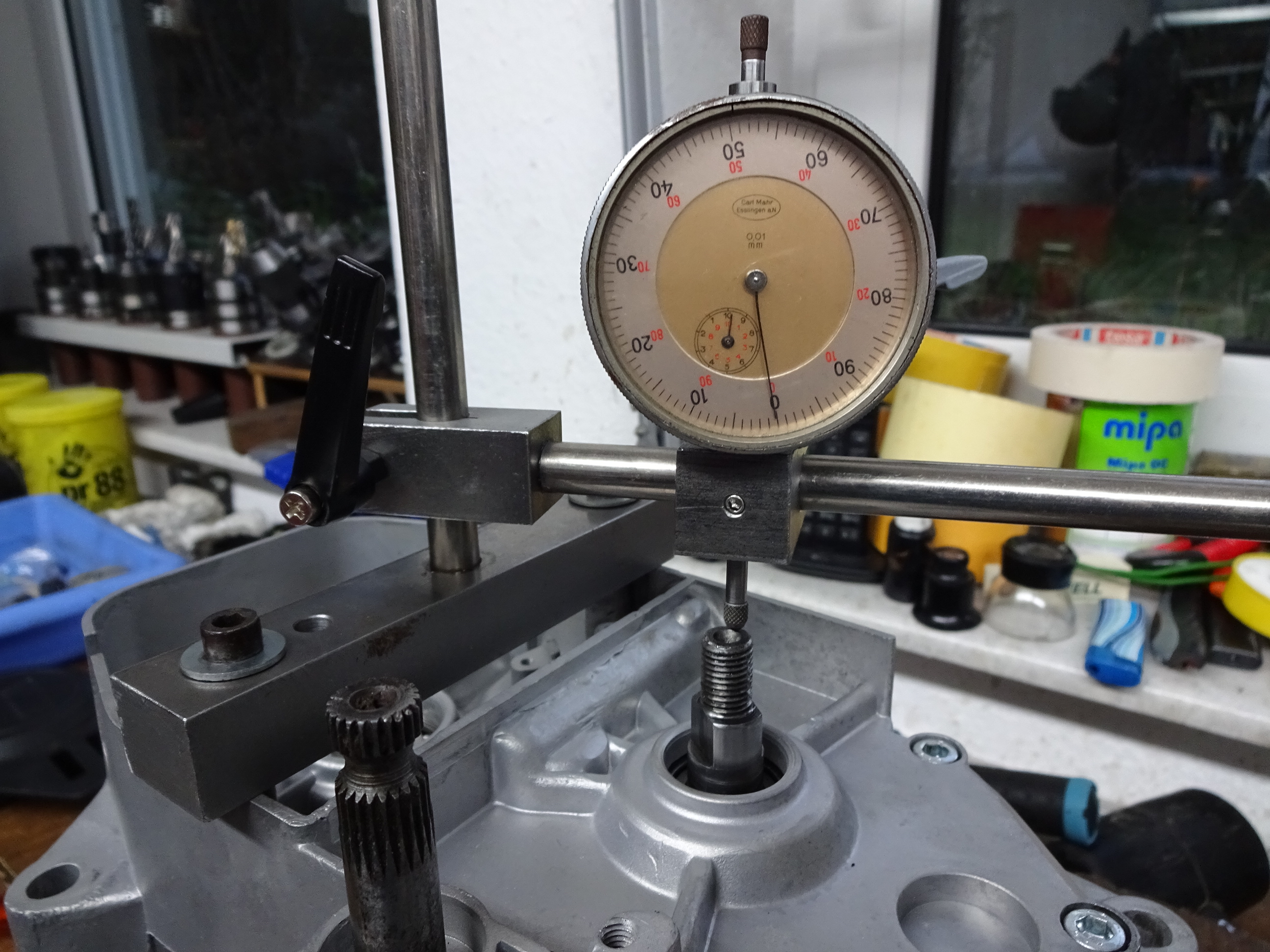 Die Getriebewelle hatte ohne irgendeine Scheibe 0,7mm Spiel, nach dem Ausgleichen 0,1mm. Ich musste aber noch mal messen und ausgleichen, manchmal klappt es nicht in einen Anlauf