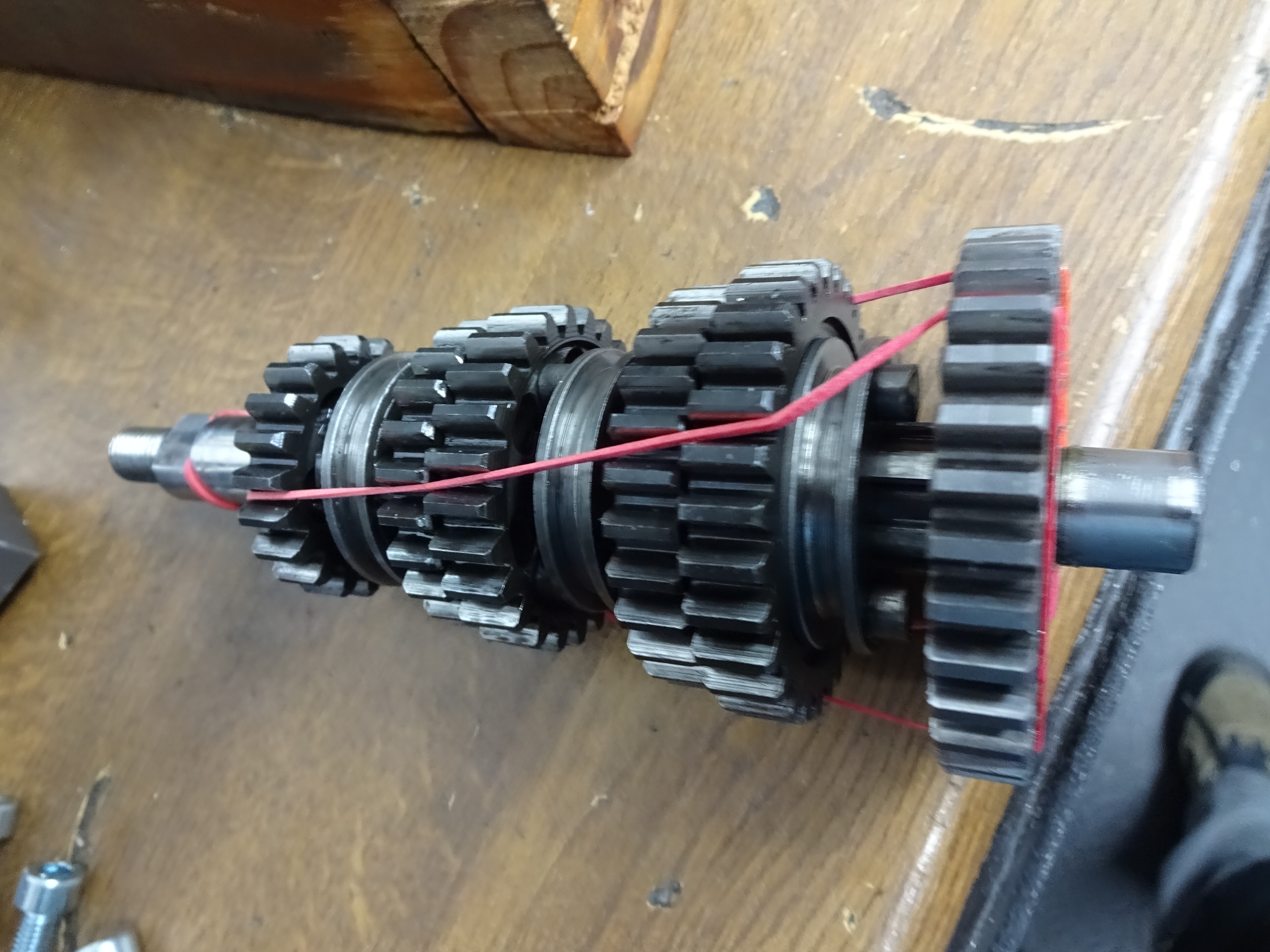 So kann man die Welle zusammen mit den Schaltgabel und der Schaltwalze problemlos montieren. Nachher einfach die Gummis durchschneiden und entfernen.