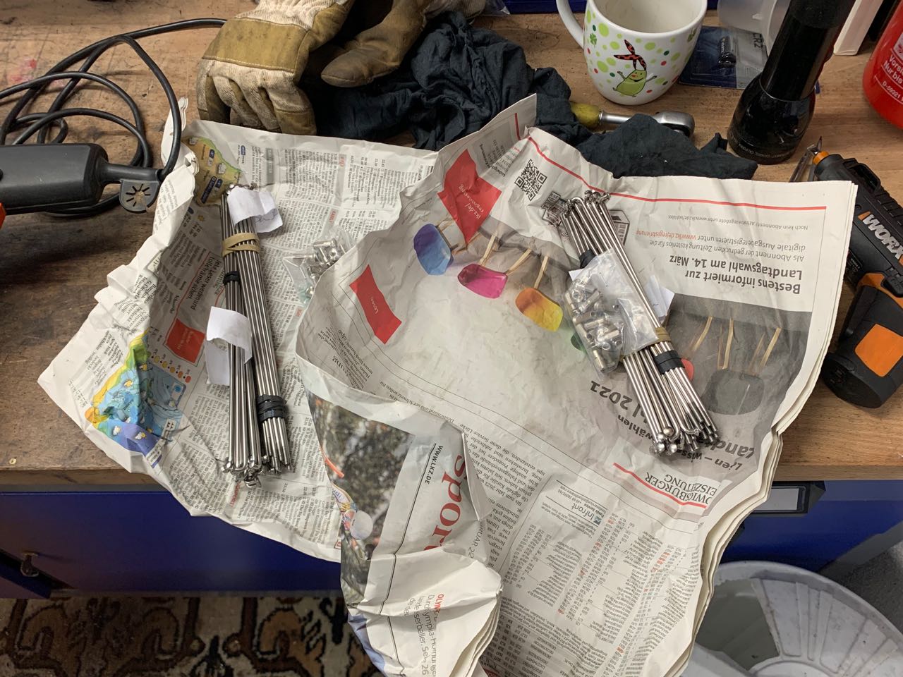 Gut 30 Minuten unter Beachtung der Corona Regeln im Auto gewartet, dann kam ein Mädel mit den Speichen, hat mir erklärt, dass die Speichen unterschiedliche Kröpfungen haben, 85 ° und 90°, entsprechend für innen und außen. Da ich wohl ziemlich blöd geguckt habe, hat sie es mir mit innen und außen erklärt und auch die Speichen entsprechend für Blöde gekennzeichnet. Irgendwann habe ich es dann auch verstanden. Ich hatte insgesamt wohl einen nachhaltigen Eindruck hinterlassen, hat sich dann im Rahmen des späteren Workshops glücklicherweise bezahlt gemacht...