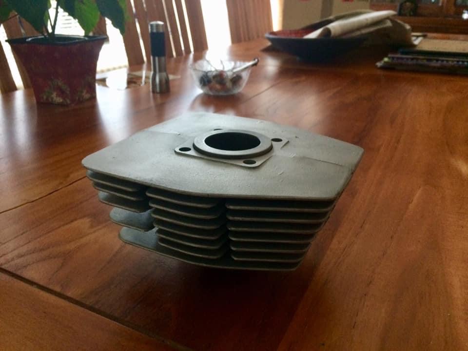 der glasperlgestrahlte Zylinder und Kopf ist zurück und mit dem neuen Auspuff und gereinigten Vergaser vereinigt worden ::-