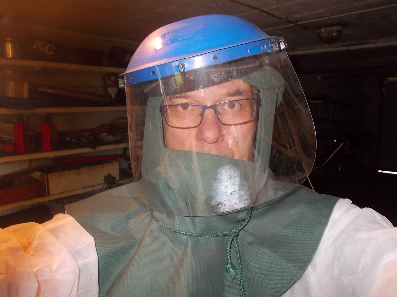 Eine Sandstrahlhaube aus Ebay, aber ohne Glas. Das war auch viel zu schnell beschlagen. Dann noch ein Sichtschutz für Freischneidegeräte. Auch billig aus Ebay, zusammen keine 30€.