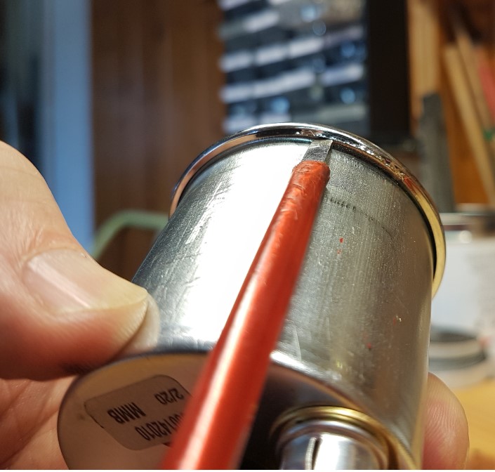 Um ihn aus der misslichen Lage zu befreien bleibt nichts anderes übrig, als den verchromten Haltering für die Glasscheibe aufzubördeln.