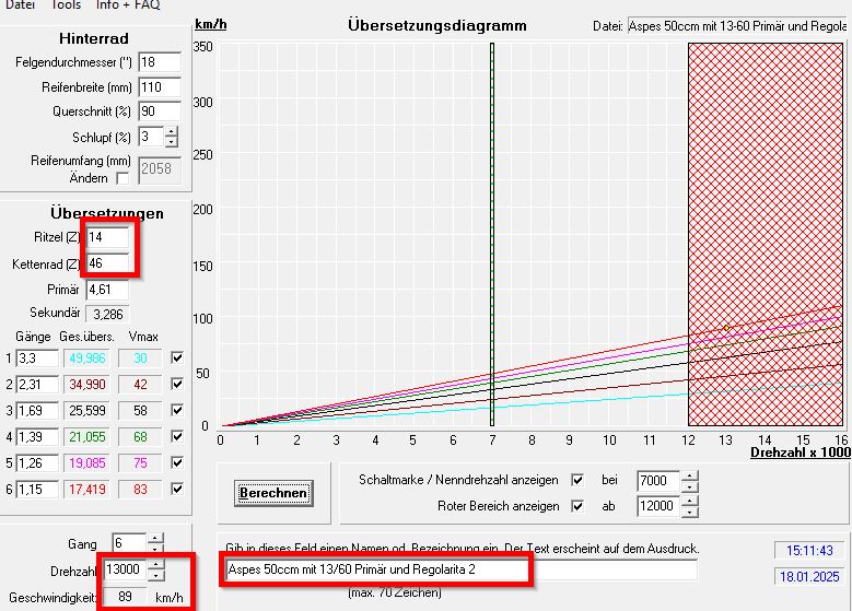 Jetzt gehen wir mal von Drehzahlen 13.000 U/min aus, dann läuft eine Aspes mit Regolarita 2 dann auch ihre 89 km/h