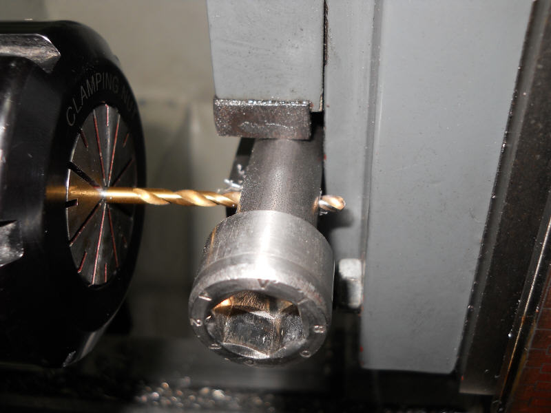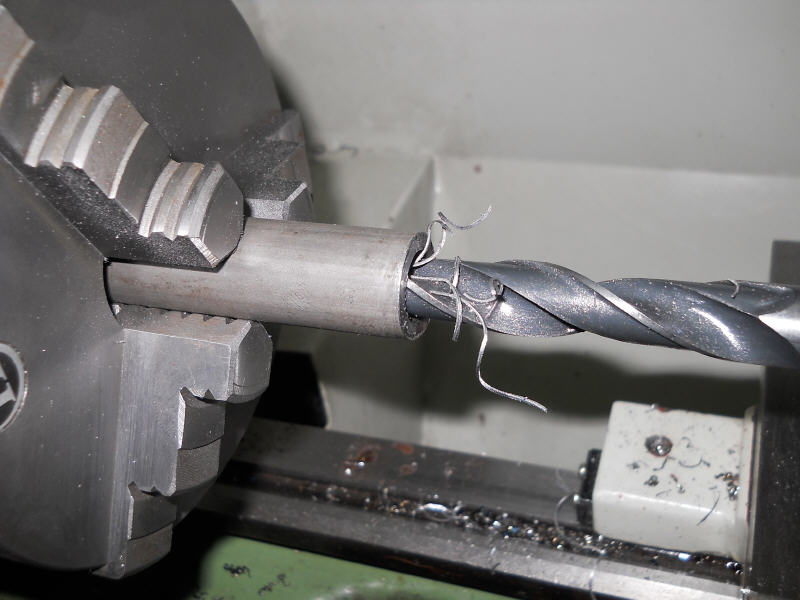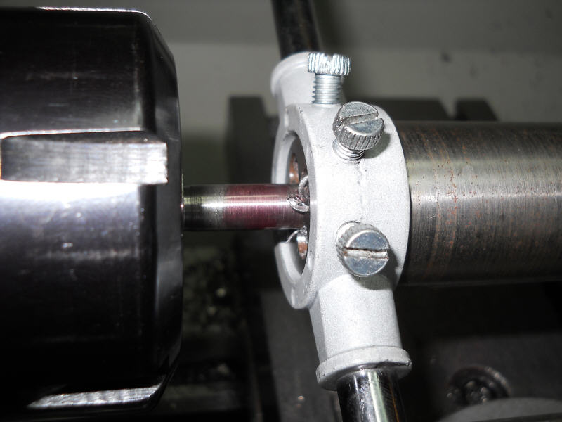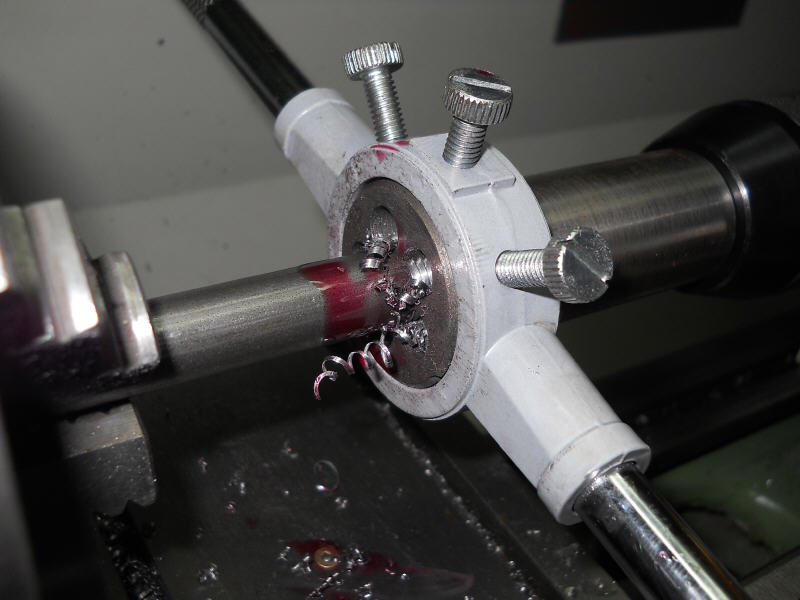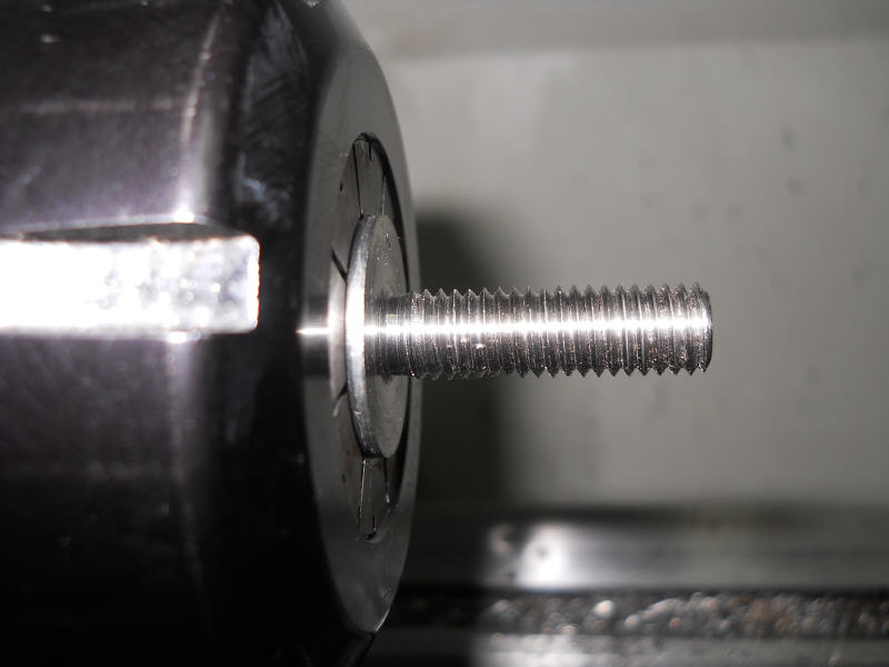 Ab auf die Drehbank mit der Schraube und erst mal das zu große M14 Gewinde auf 8mm abgedreht.