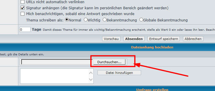 Wenn ihr einen Beitrag schreibt, habt ihr genau unter dem "Absenden" Button die Möglichkeit eine Datei auf eurem Rechner zu suchen