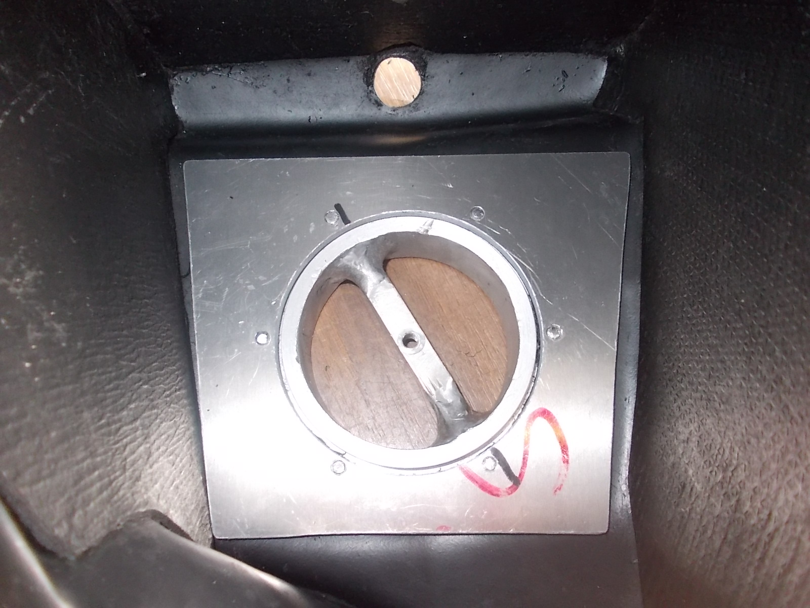 Hab aber schon am Luftfilterkasten losgelegt, das Anschlussstück war noch nicht komplett fertig. Hatte zuerst nicht beachtet, das Schrauben und Mutter den sauberen Anschluss des Luftfilters behindern würden. Also musste ich von innen eine Platte machen mit Innengewinden, damit der Luffilter auf der Platte sauber aufliegen kann.