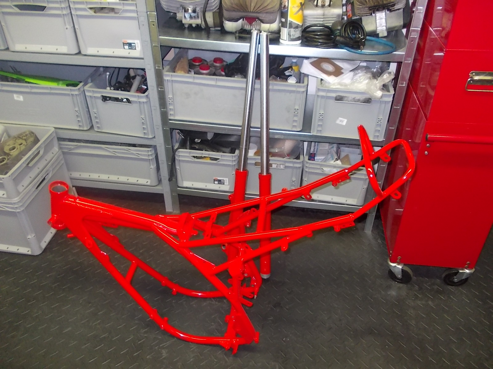 So der Anfang ist gemacht, Rahmen und Gabel sind zwei Stockwerke nach unten gelangt.