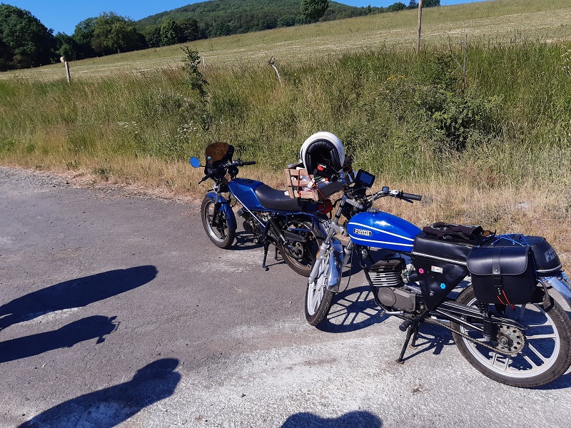 Auf dem Weg zur Mittagspause zickte die Zündapp wieder mal und ging im Stau aus. Daniel und Stefan sind dann vor geheizt. Mit der zickenden Zündapp ging das nicht am Stau vorbei. Danach haben die Elke und ich das Moped getauscht. Die Zündapp lief nur noch bei Vollgas. Also hab ich das Gas die letzten 30 km bis zur Mittagspause stehen lassen. Als die Elke dann eintraf, war der Vergaser schon wieder sauber. Ab der Mittagspause lief dann alles wieder reibungslos. Direkt danach haben wir getankt. In die Gilera gingen nur 4,5 Liter rein. Das wäre ein Verbrauch von ca. 3 L /100! Wieder zurück hat sich die Gruppe dann leider getrennt. Man dinierte im Restaurant, dabei waren die Steaks und Fritten am Platz echt super. Schade eigentlich..
