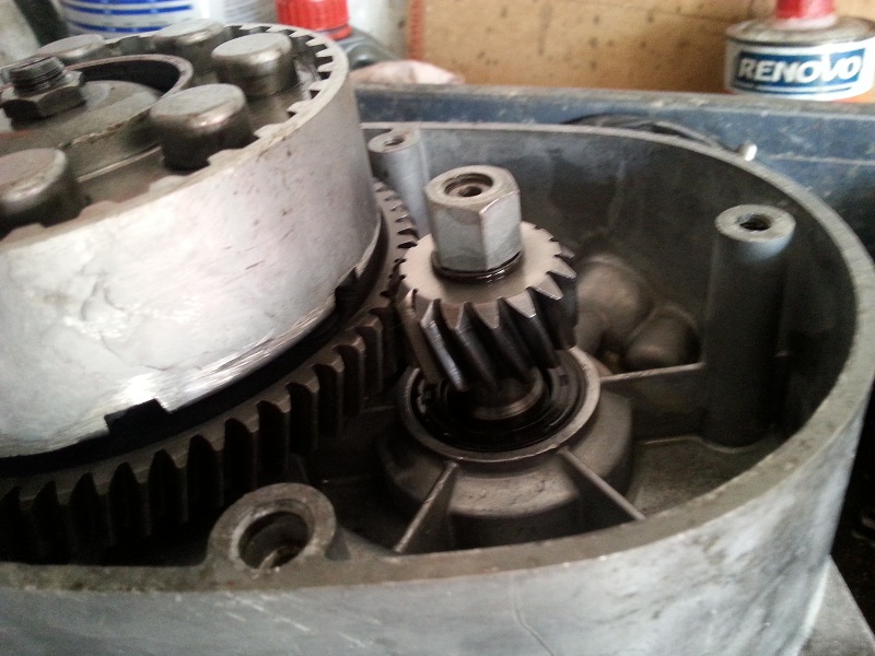 Das Getriebeöl war goldgelb und ohne Wasser. Beim Abnehmen des rechten Deckels gab es wieder mal keine Dichtung, sondern Dichtmasse.