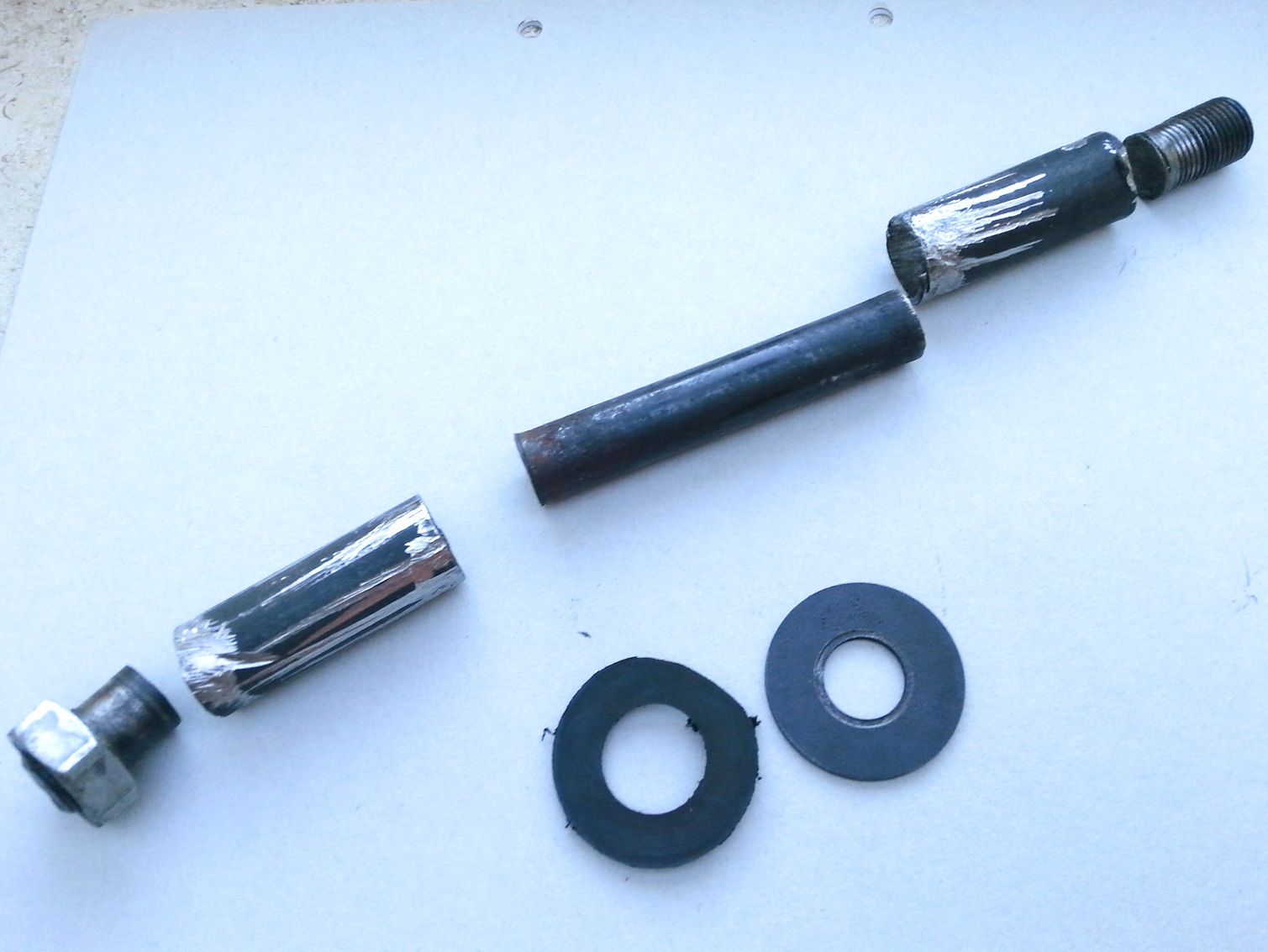 Hier haben wir nochmal die Achsfragmente. Daran die inneren Rohre der Silentbuchsen. Dabei sind 4 Karosseriescheiben 14x35 (leider kein Normmaß) und 4 Kunststoffscheiben 18x35 als Dichtung vor Spritzwasser.