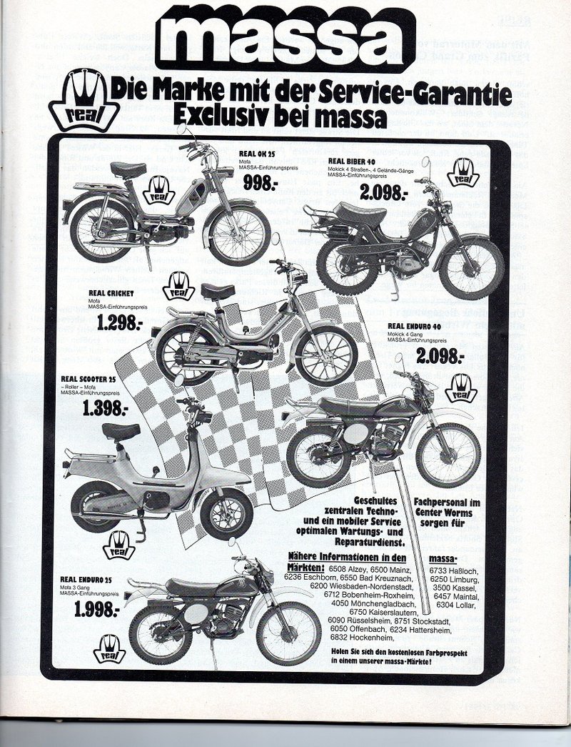 Hatte tatsächlich das Real Enduro Mofa, seinerzeit im Massa Markt in Mönchengladbach gekauft, von dort aus dann mit 27 km/h über Radweg nach Krefeld zurück. Bereits beim Kauf waren u.a. die Gabelsimmerringe undicht, wurden dann später im Rahmen der Inspektion gewechselt. Für die Inspektion musste man wieder -nach Terminvereinbarung-zum Massa Markt fahren, es kam dann ein mobiler Monteur aus Alzey glaube ich, die Inspektion fand dann hinter dem Markt bei der Warenannahme statt.