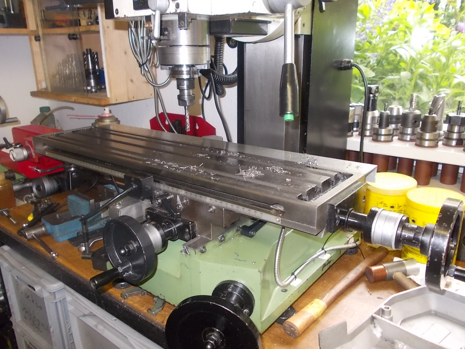 In der Werkstatt wurden viele Späne gemacht. Stephan brauchte eine Adapterplatte für eine Planscheibe an seiner Drehbank. Also haben wir man so was für ihn inkl. Bohrungen auf Drehe und Fräse gemacht.