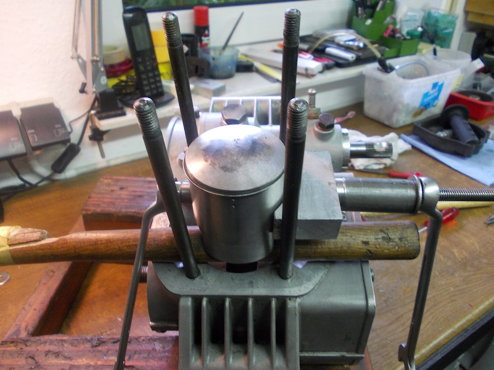 Mit dem Einziehwerkzeug ging der Originalbolzen sauber in den Kolben. Jetzt schnell mal den Zylinder aufgesteckt und geschaut wie „mittig“ das Pleuel zwischen den Wangen steht. ::- Perfekt ::-