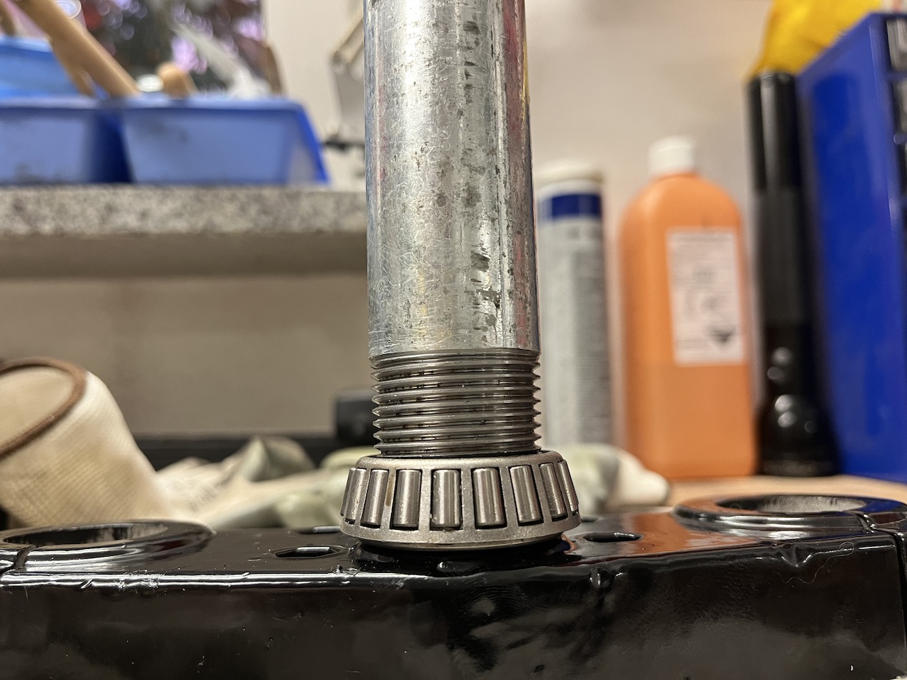 Aktuell beim Zusammenbau, die Schwinge wurde statt mit diesen Messingbuchsen mit originalen Silentbuchsen bestückt, Lenkkopflager erneuert, revidierte Gabel mit Vorderrad ist drin, der Rest geht nun hoffentlich deutlich zügiger voran.