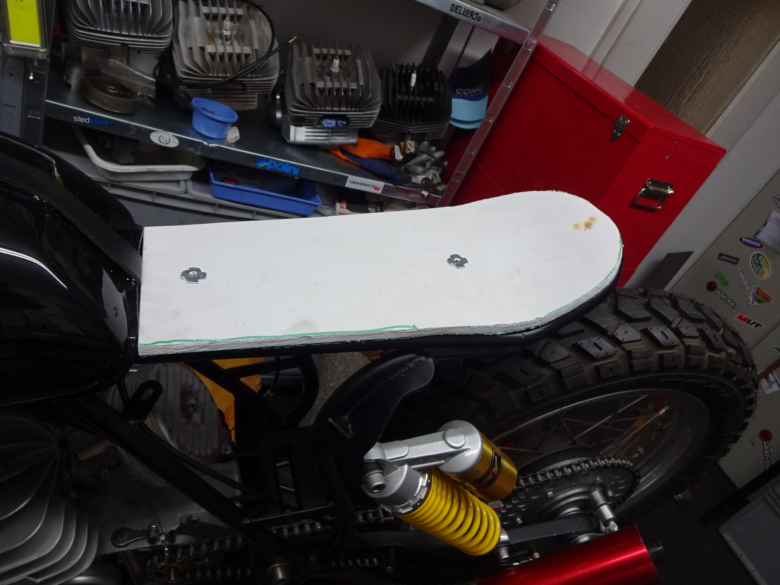 Hatte auch mal den Kotflügel recht tief positioniert, hat mir aber überhaupt nicht so recht gefallen. Da ich auch noch nen passenden Gummi für die dickere Rahmenschleife gefunden hatte, war klar: Kotflügel kommt nach oben. Musste dann ein wenig die Sitzbank ausschneiden, damit die über den Halter passt.