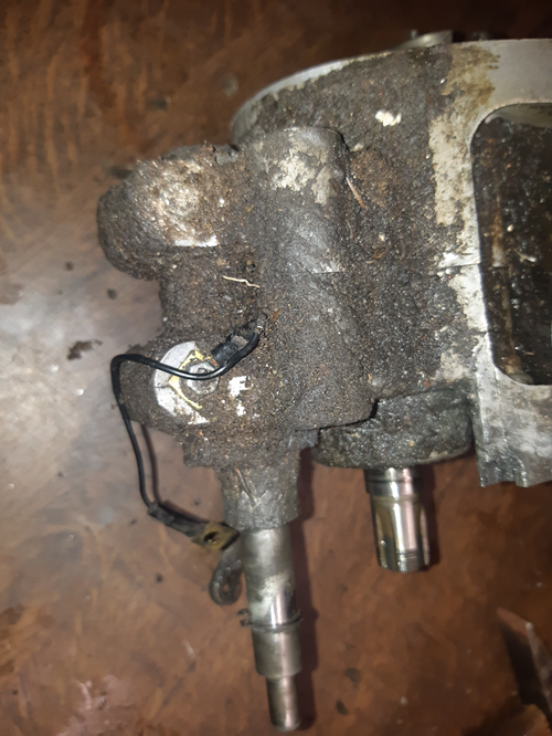 Geiles Konstrukt ist auch die Welle, auf der der Kickstarter sitzt. Bei anderen Motoren mit dem Gehäuse läuft an der Stelle eine Pedalwelle durch. Hier ein Bolzen mit leichtem Versatz auf der Ritzelseite, da kommt dann der Kickstarter drauf. Und unter dem Versatzstück sitzt die 9. Motorschraube. Also grob die halb versteinerte Öl Matsch Dreck Kruste weg, die Klemmteile raus die den Bolzen halten und raus mit dem Ding.