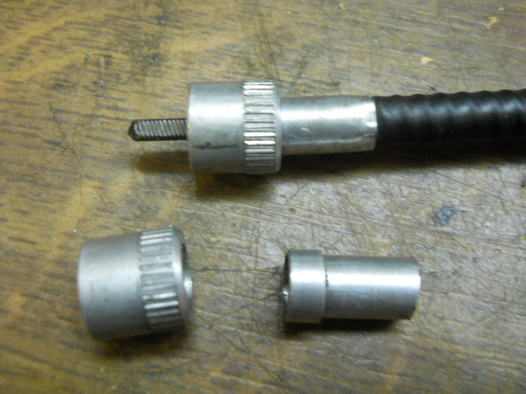 So jetzt hab ich mich an das leidige Tachoantrieb-Thema gemacht. Mein Problem, ich hab weder ne passende Tachowelle noch einen Antrieb der passte. Alles was ich an Antriebe hatte, kam viel zu weit an die Nabe ran, da ging nicht nicht mal die Rändelschraube hin. Das was ich zusammen kramen konnte, war ein CEV Antrieb für den Veglia Tacho und eine zu beiden passende viel zu lange Welle.
