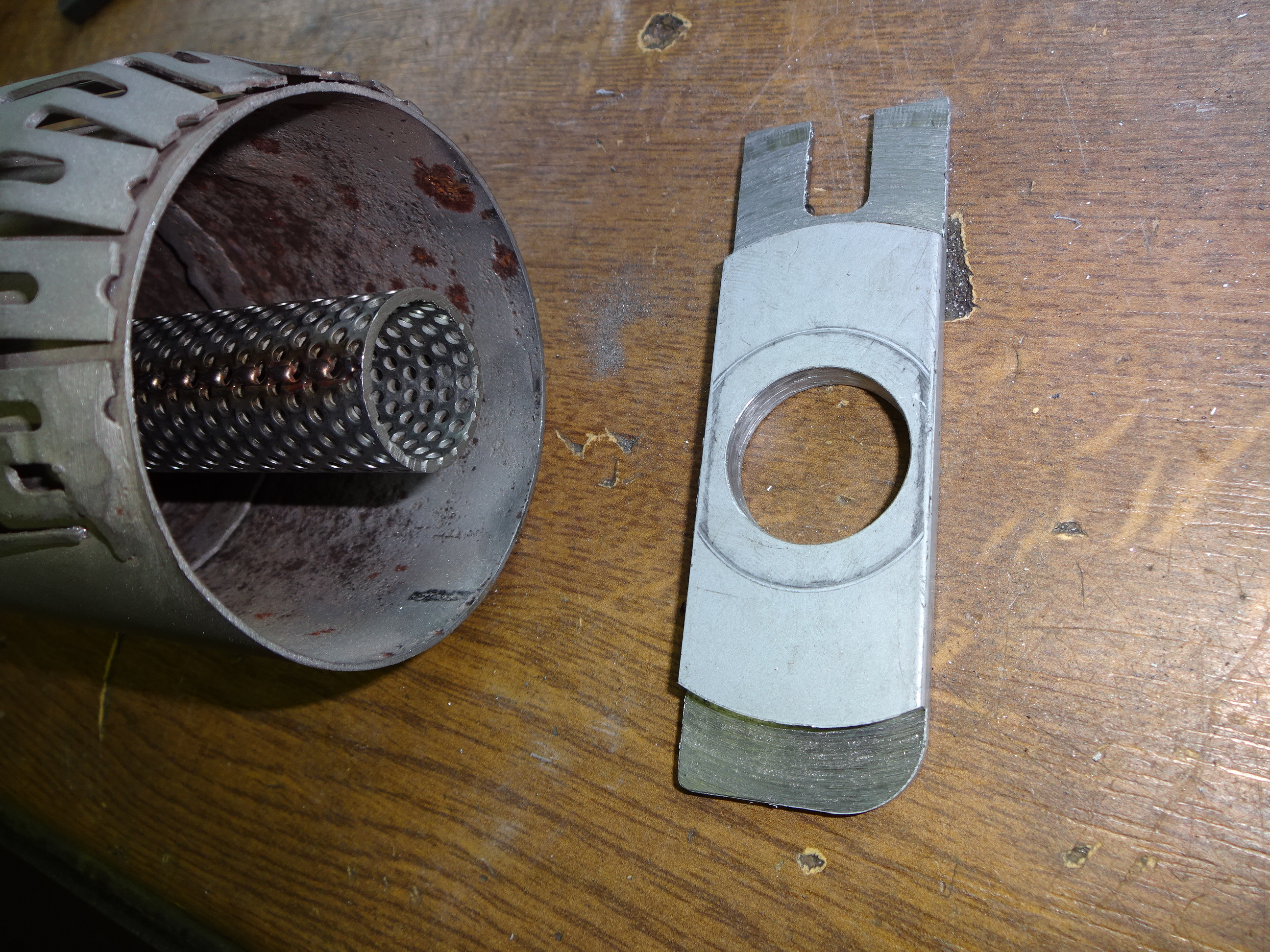 Hier ist eine Seite (welche nachher im Dämpfer verschwindet) schon bearbeitet. Die Kratzer kommen durch die Innenseite des Schalldämpfer. Der Steg bleibt so dick, damit genug Fleisch für das Gewinde von 1 oder 2 Halteschrauben ist.