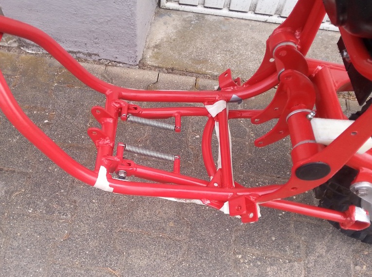 An den Rahmen unterhalb des Motors gehören noch zwei Anschlaggummis für den Mittelständer hin. Du siehst ja, dass an den Knotenblechen passende 6mm-Löcher sind. Sonst machst Du Dir bald den Rahmen/Lack kaputt!