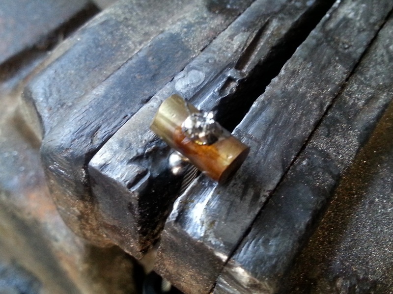 Das Drahtende im Nippel mit einem spitzen Gegenstand aufspleißen, damit sich der Draht mit dem Lot gut in der Bohrung verkeilt.