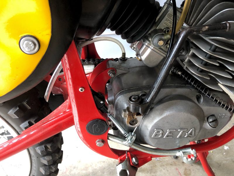 Das Befestigungsloch war schon im Rahmen (auf beiden Seiten). Warum auch immer. Für den Bremslichtschalter erfüllt es seinen Zweck. Zumindest auf der rechten Seite. Der Schalter ist recht unauffällig. Vielleicht könnte ich statt der auffälligen Feder alternativ ein Drahtgestänge einhängen, aber ich lasse es erstmal so.