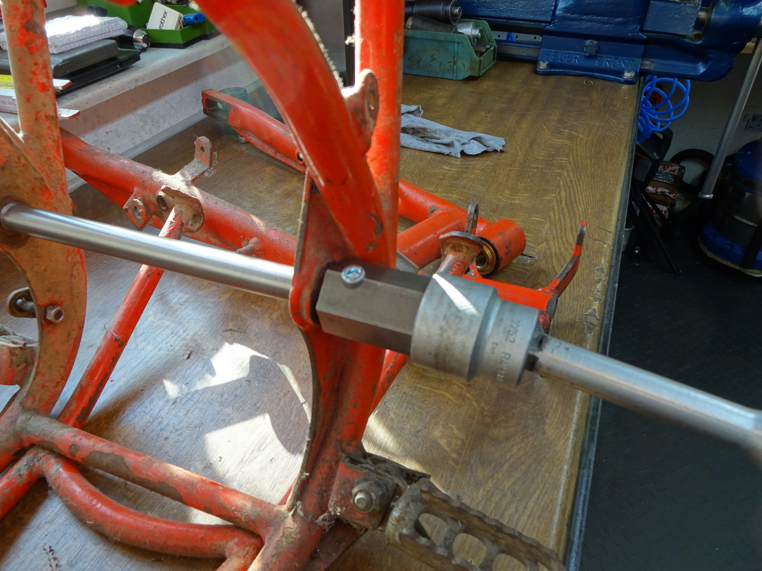 Dann musste ich mir noch ein Werkzeug basteln un die Achse vernünftig festziehen zu können, hätte sonst den Rahmen verkratzt.