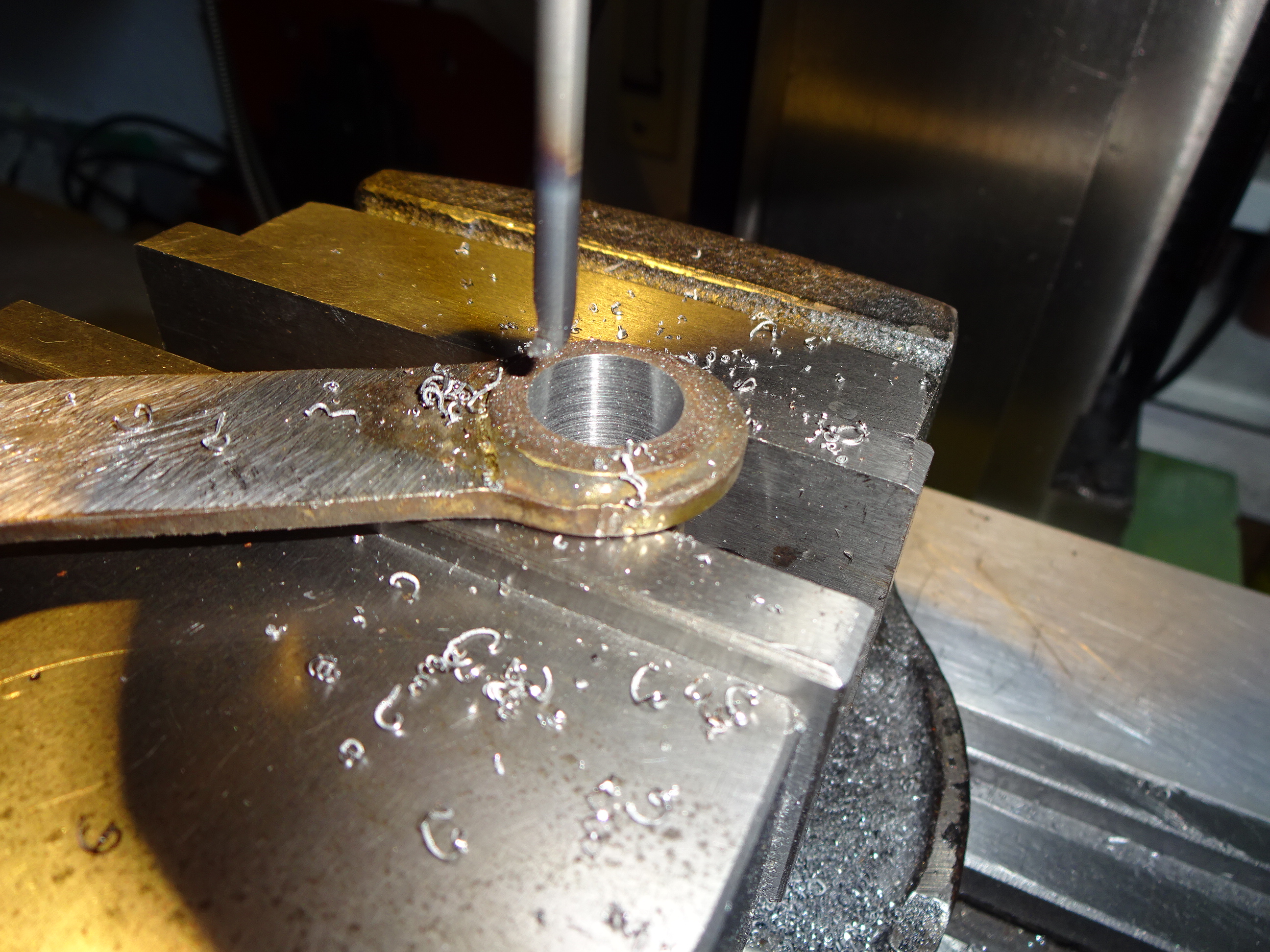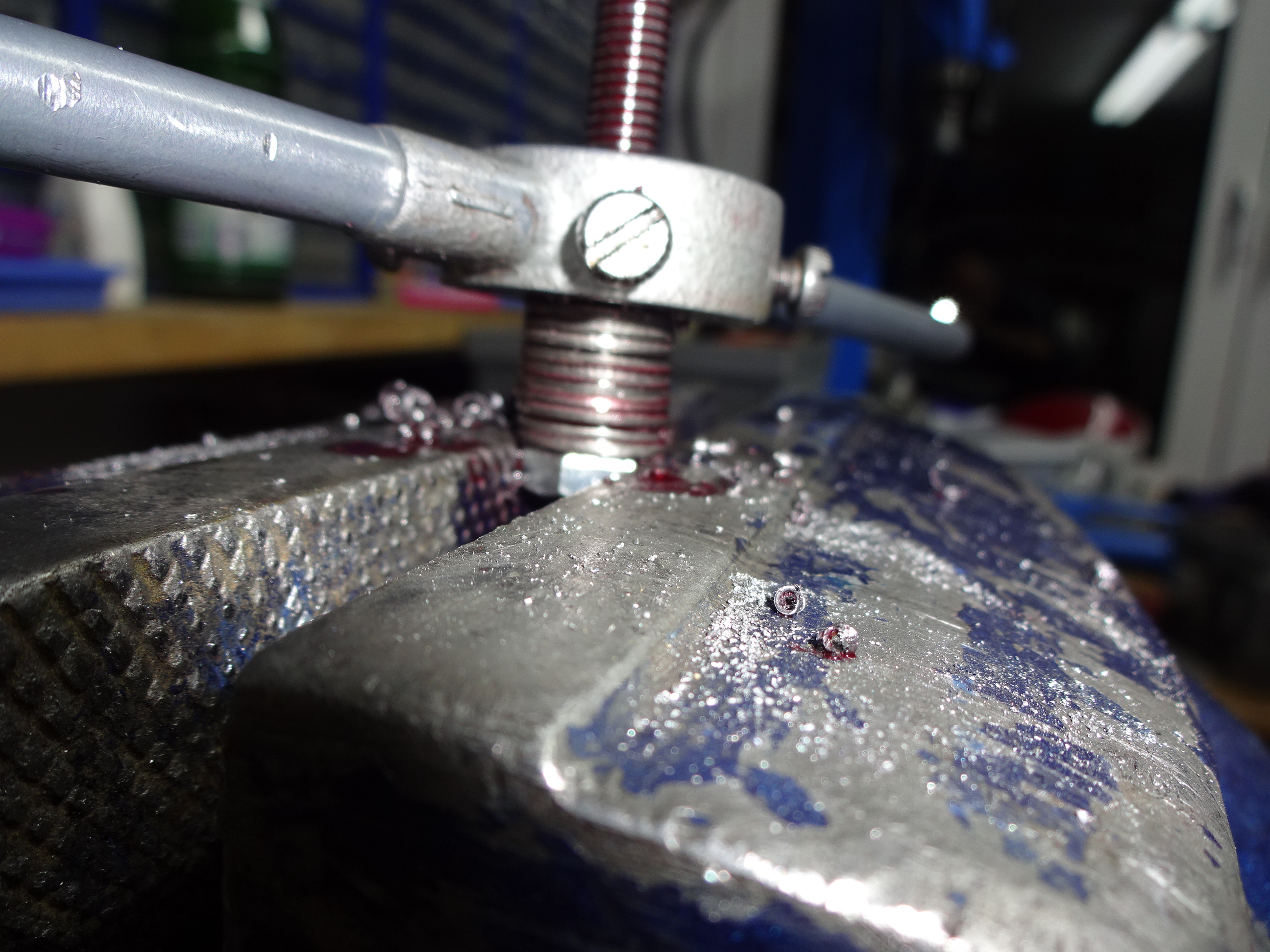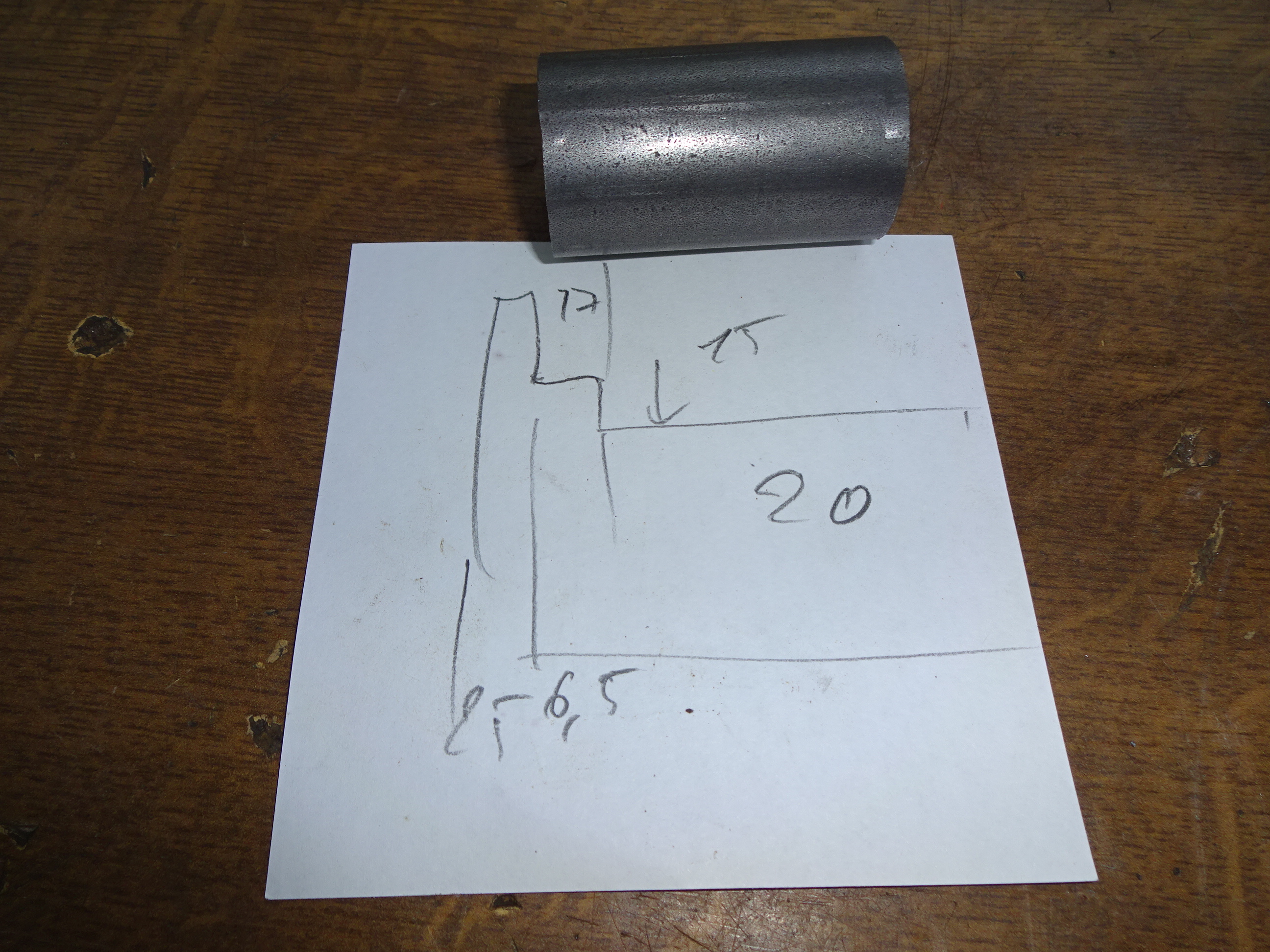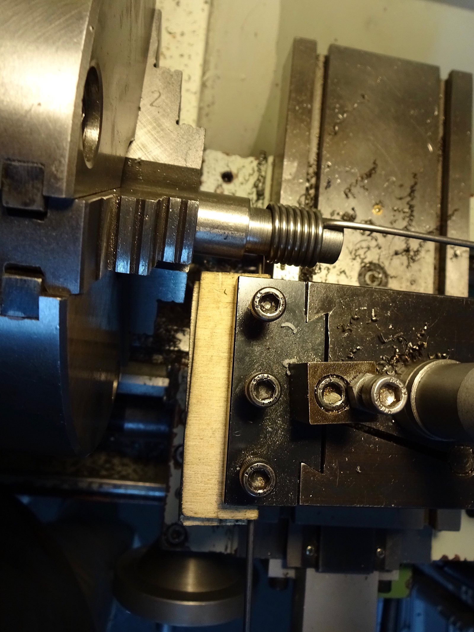 Deshalb erst mal einen passenden Wickeldorn mit Bohrung erstellt, sowie eine quick und dirty Führung für den Federstahl. Den Vorschub der Drehbank durch Räderwechsel etc. auf 2,5mm pro Umdrehung gestellt. So dick ist nämlich mein Federstahl und es wird ja ne Torsionsfeder, da liegen die Wicklungen ganz nah beieinander.