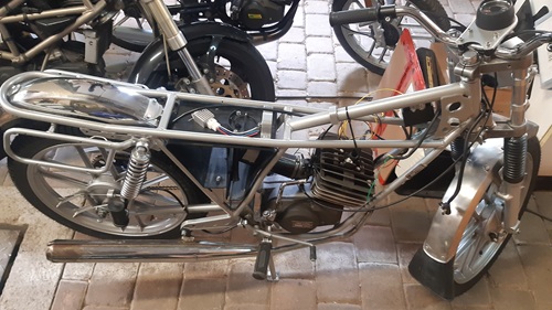 ich hab für den Bad Hersfelder Moped Marathon dann doch schnell den Corsa Corte Motor gegen einen normalen P4 mit dem 70 Kubik Polini Membranzylinder getauscht. Problem war da noch der Auspuff, also was zurechtgeschweißt und einen normalen 50er Auspuff draufgesteckt. Vergaser war der 19er drauf, den ich am Corsa Motor habe und geändert hab ich genau gar nix dran. Motor rein, Zündung vom Corsa Motor in den P4, so musste ich nix am Kabelgelerch ändern. Ritzel auch gleich, nix an der Kette geändert. Angekickt, läuft,hält Standgas, fährt. Kraft von unten raus, aber halt nur 55 Klamotten Spitze. 30 km Probefahrt, mehrmals die Kerze angekuckt. Eher zu dunkel als zu hell. Egal, besser so als oder so