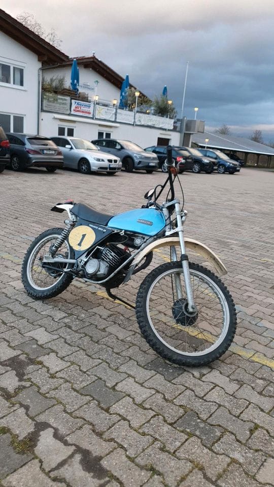 Cool ist, dass du die hochwertigen Räder mit Alufelgen und Halbnabenbremsen hast. Eine Maske war vorne nicht dran, vielleicht eine Startnummerntafel über dem Scheinwerfer. Die Federbeine kenne ich nicht, sollten original Matzocchis AG 1 dran. Kotflügel hinten scheint abgeschnitten zu sein. Ersatz ist als Repro oder gebraucht durchaus beschaffbar. ESD ist leider nicht origina, aber auch noch in Italien aufzutreiben.